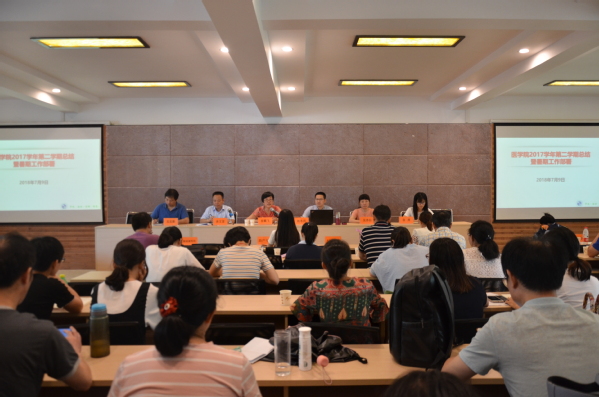 7月9日下午,医学院在实训多功能厅召开2017-2018-2学期期末教工大会。医学院领导班子和全体教职工参加了本次会议。校党委书记崔戴飞莅临并作讲话指示。会议由医学院党总支书记余文富主持。