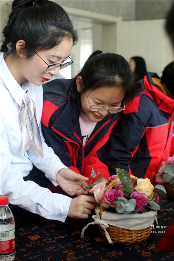 大学生志愿者设计了不少互动环节,让衢州市特殊教育学校的学生们参与其中,教他们用板蓝根染布、教他们插花、制作心理沙盘、辨识草药……
