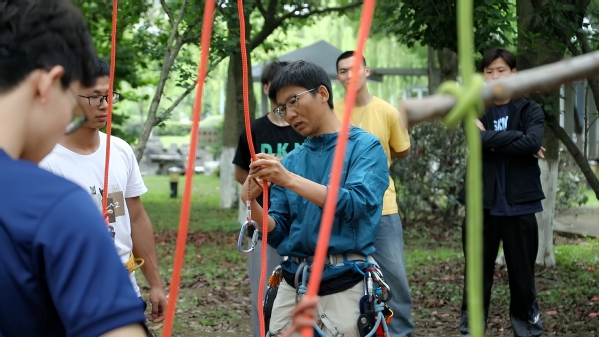 在攀树实操环节,张督成总是拿“放大镜”观察学生。潘豪杰回忆,自己第一次用“挺身式上攀技术”攀树时不太顺利。张督成在旁边仔细观察了几分钟,发现了症结所在。“你的布莱克式抓结多打了一圈,导致它摩擦力增大,难以上下移动。还有你的发力点错了,应该是腰腹,而不是腿部。”张督成重新帮他打了绳结,用手指在他腹部精准圈定了发力部位。潘豪杰仿佛瞬间被打通任督二脉,攀起树来又快又好。