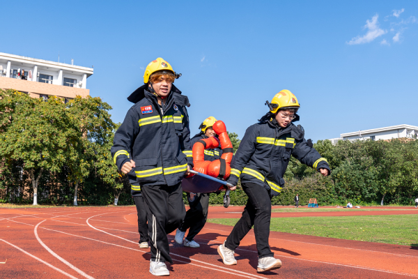 本次运动会设置了消防战斗服原地着装、灭火接力、火场逃生、抬送120斤假人“伤员”等消防技能比赛项目。同学们在实际操作中学习如何正确使用灭火器、快速连接水带以及掌握逃生技巧。这些项目不仅考验了同学们的体能和反应速度,更重要的是让他们在轻松愉快的氛围中掌握了关键的消防技能。